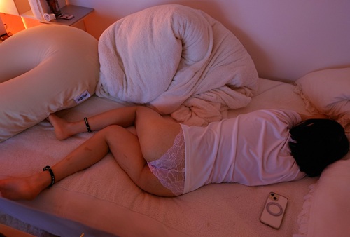 【画像】横になる人妻さん、脱いだら透け透けパンティだった